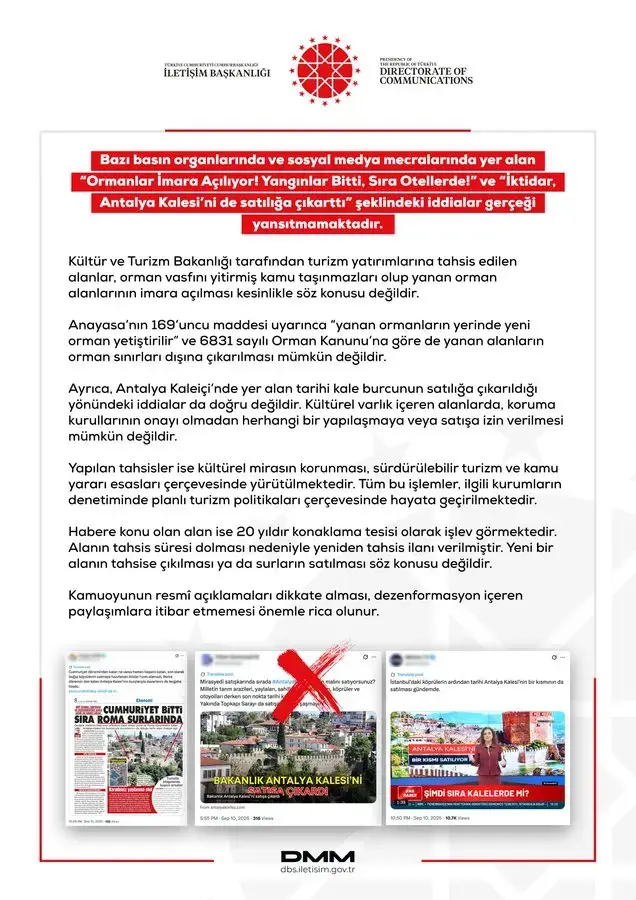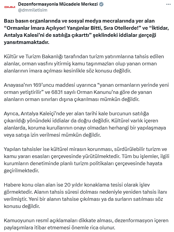 İletişim Başkanlığı Dezenformasyonla Uğraş Merkezi kelam konusu argümanları yalanlayarak X hesabından dikkat çeken bir açıklama yayımladı. Açıklamada şu tabirler yer aldı; “Bazı basın organlarında ve toplumsal medya mecralarında yer alan “Ormanlar İmara Açılıyor! Yangınlar Bitti, Sıra Otellerde!” ve “İktidar, Antalya Kalesi’ni de satılığa çıkarttı” biçimindeki argümanlar gerçeği yansıtmamaktadır. Kültür ve Turizm Bakanlığı tarafından turizm yatırımlarına tahsis edilen alanlar, orman vasfını yitirmiş kamu taşınmazları olup yanan orman alanlarının imara açılması muhakkak kelam konusu değildir. Anayasa’nın 169’uncu hususu uyarınca “yanan ormanların yerinde yeni orman yetiştirilir” ve 6831 sayılı Orman Kanunu’na nazaran de yanan alanların orman sonları dışına çıkarılması mümkün değildir.