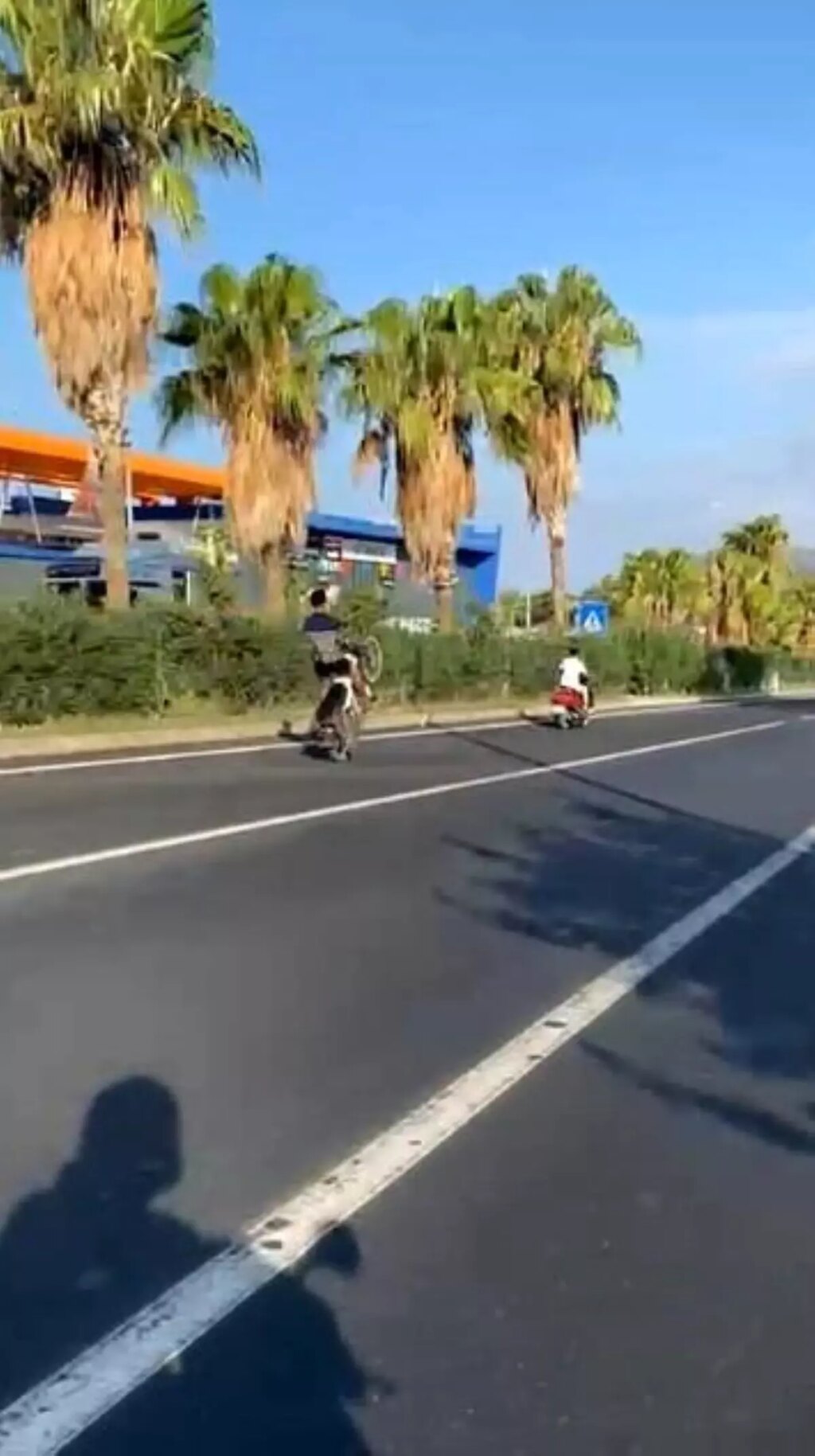 Antalya’nın Gazipaşa ilçesinde kasksız motosiklet şoförü, D-400 Karayolu’nda motosikletin ön tekerini kaldırarak ilerledi. Hem kendi canını hem de trafiği tehlikeye atan şoförün o anları cep telefonu kamerasına yansıdı.