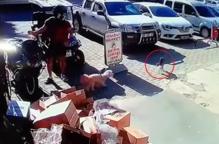 Alanya'da motosikleti ve köpeğiyle bir iş yeri önüne gelen A.S.S., köpeğiyle hengame eden kediyi...