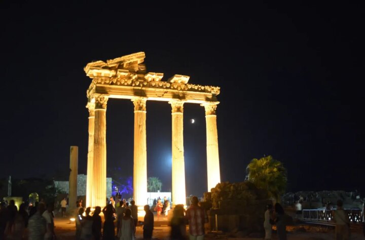 Antalya'nın Manavgat ilçesinde, Apollon Tapınağı görüntüsünde gerçekleşen kanlı ay tutulması, turistler tarafından ilgiyle izlendi....