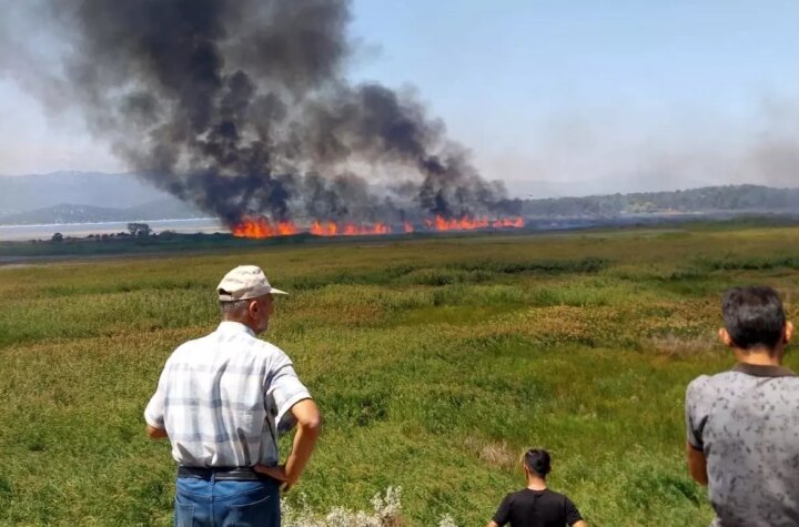 Konya'nın Beyşehir ilçesinde sazlık alanda çıkan yangın, ormanlık alana sıçramadan Antalya'dan gelen helikopterle havadan...